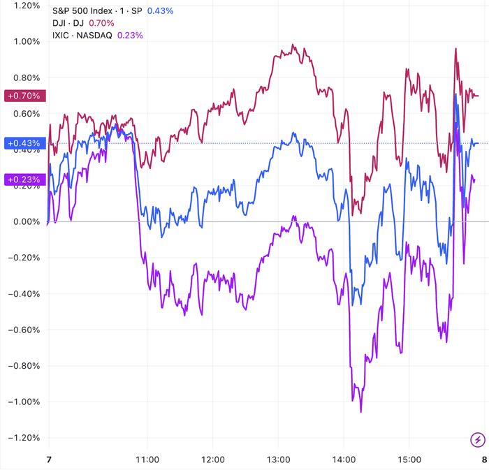 截至收盘,道琼斯指数涨0.70%,报41,113.97点;标普500指数涨0.43%,报5,631.28点;纳斯达克指数涨0.27%,报17,738.16点。