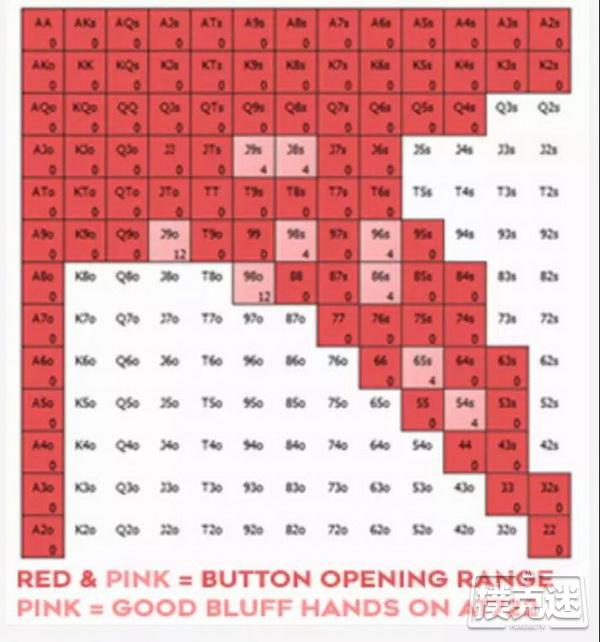 在按钮位44.19%的开池范围中,适合在河牌诈唬的手牌标记为粉色