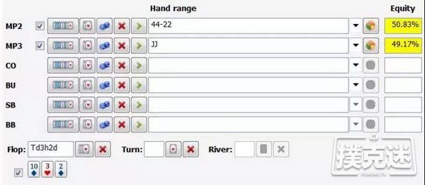 如果我们在$100的底池下注75,他加注到225,根据底池赔率,我们需要27%的胜率才能跟注。我们来计算一下高对(JJ)面对Rafi估测范围(44、33和22)的胜率。
