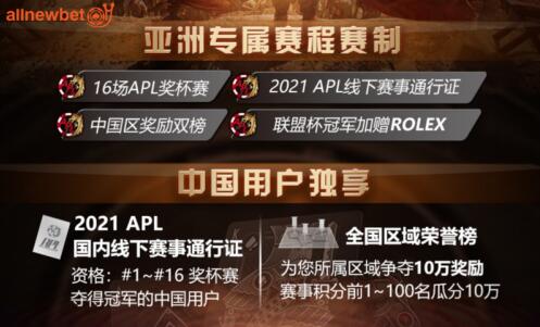 ♦奖杯赛冠军可获得2021 APL线下赛事通行证